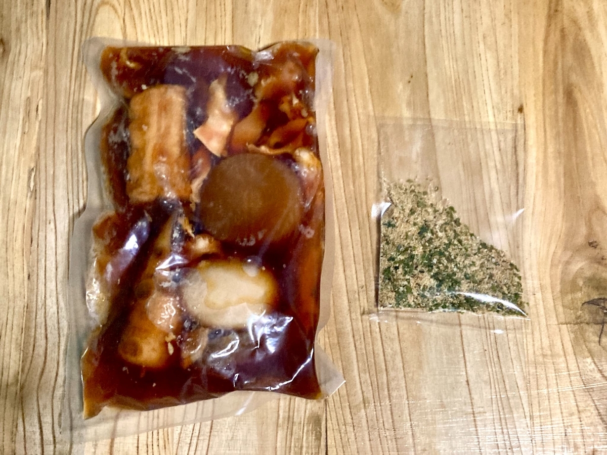 中には、おでんのレトルトパウチと出汁粉が入ってます。