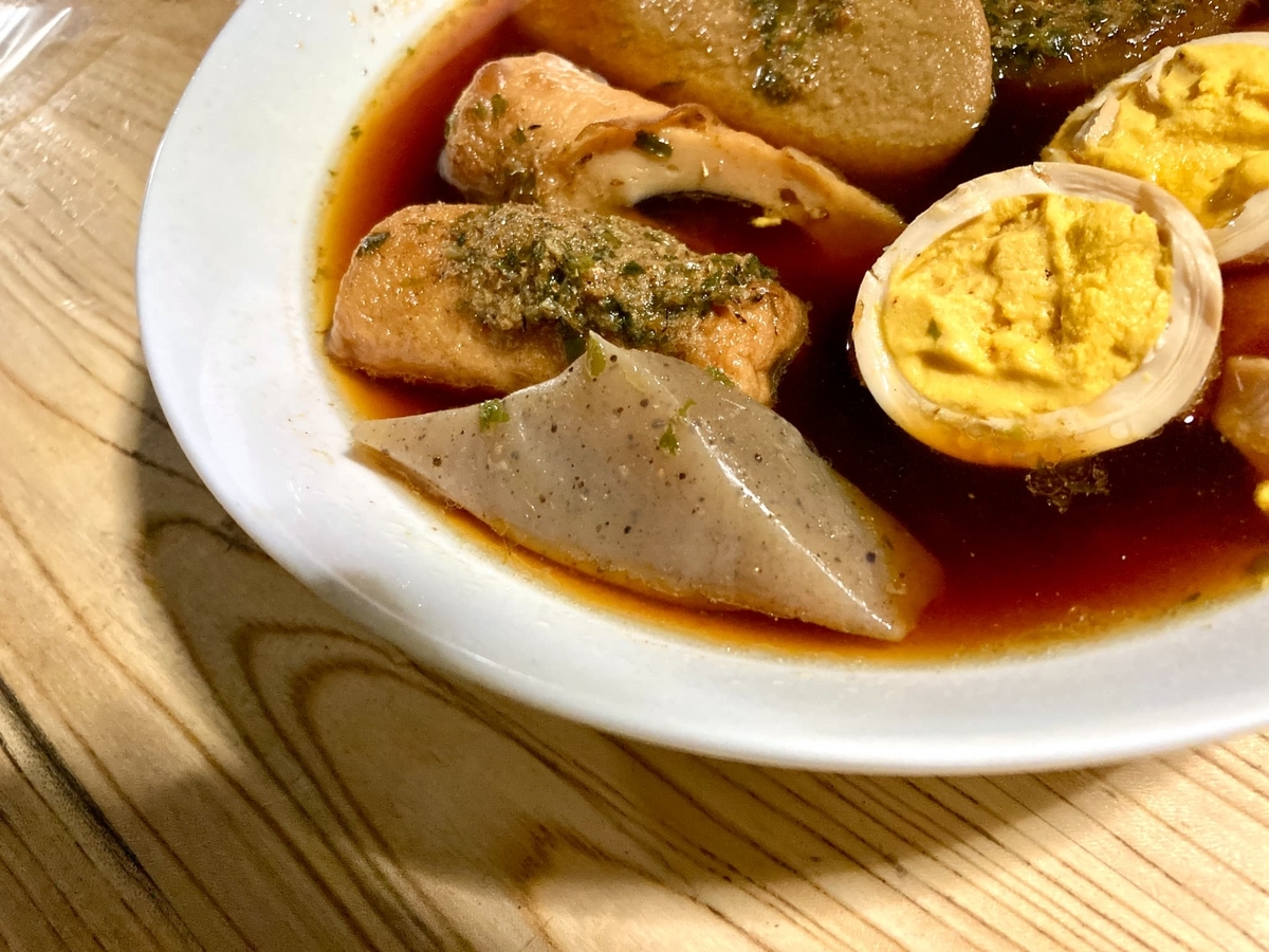 出汁がしっかりと感じられる醤油味の黒いつゆに練り物やプリプリの牛すじ、卵、味がしみた大根などとにかくおいしかったです。
