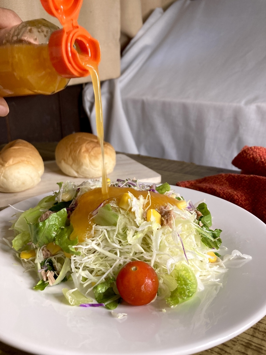 コンビニで買ったサラダではありますが、オレンジ色のドレッシングをかけると思った以上に華やかです。